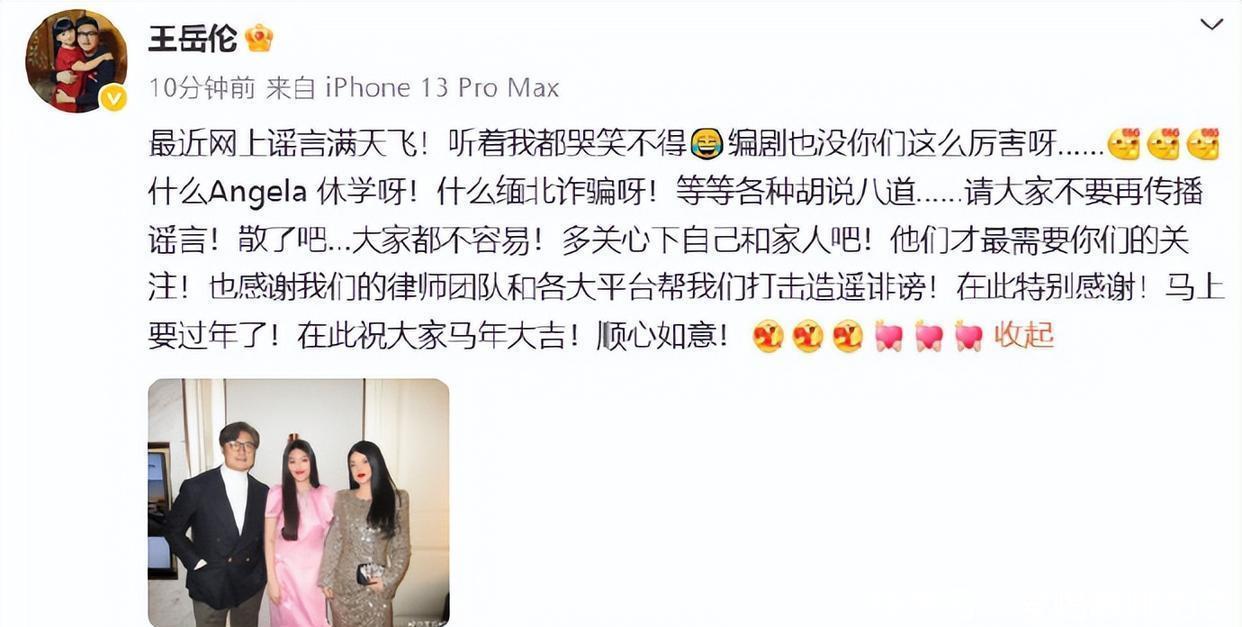 因此,在1月26日,王岳伦亲自下场回应网络猜测与传闻:先是否认了女儿王诗龄“休学”的传言,更直接拍板李湘“涉缅北诈骗”是彻头彻尾的谣言!王岳伦发文无奈写道,“听着我都哭笑不得”,最后还劝大家“散了吧…大家都不容易!多关心下自己和家人吧!”,字里行间满是无奈。